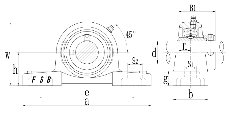 | 帶座軸承型號 | 軸 徑 | 尺 寸 | 螺 栓 | 軸承芯型號 | 軸承座型號 | 基本額定載荷 | 疲勞極限載荷 | 極限轉速(SRS) 軸的配合公差(h6) | 重量 | |||||||||||||